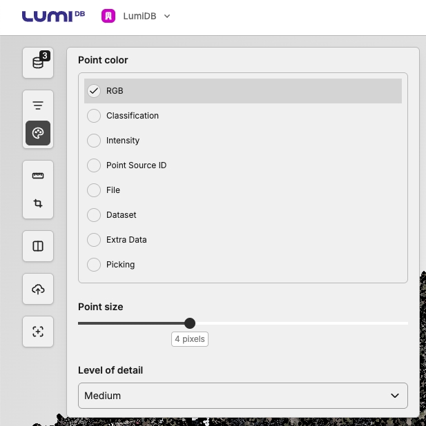 Visualization settings are found in the Display options menu. These control how point clouds are rendered in LumiDB—including color mode, point size, and level of detail.